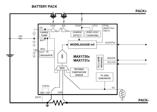 An example IC that encompasses fuel gauge, protection, and authentication functions in a single 3mm x 3mm package is the low-power Maxim Integrated MAX1730x series. Suitable for measuring the state-of-charge of lithium-ion or lithium-polymer batteries, the MAX17301 has an extremely low quiescent current, 24µA, when the output FETs are active, down to as low as 18µA during active hibernation. By disabling the load FETs, the current can drop to 0.1µA. The IC provides a comprehensive range of battery health and safety protection features, including over-voltage (temperature dependent), over-charge current, battery under/over-temperature, under-voltage, and over-discharge/short-circuit. Other features of the MAX1730x include one-wire and I2C peripheral interfaces for communication to the host microcontroller so it can read the MAX1730x’s data and control registers (Figure 1).
