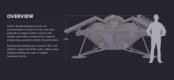 Turns out, Astrobotic is thinking a lot about lunar logistics. One is how to deliver mail 238,900 miles away, as cheaply as humanly possible. Their mail truck is a spacecraft, called the Griffin lander. Not only can it transport the mail, it has enough room on board to take 4 robotic rovers, scientific instruments and even drop off a satellite in the moon’s orbit. Specifically, it measures 5.2 feet high and 10 feet wide. It can carry more than half a ton of cargo to lunar orbit and almost 600 pounds to the moon’s surface. And talk about precise landings, Astrobotic expects it to touch down on the moon within 330 feet of a predetermined landing spot, using autonomous navigation system cameras, lasers and inertial sensors to avoid obstacles and adjust its descent.